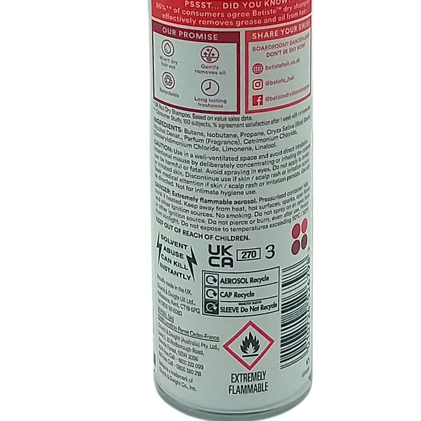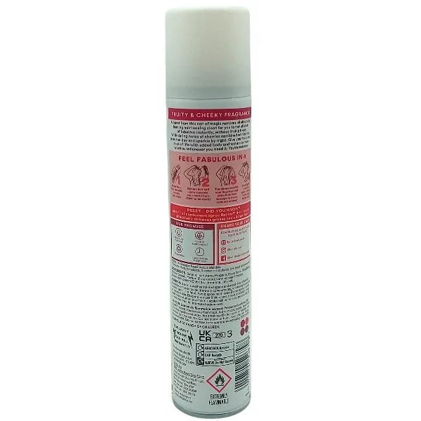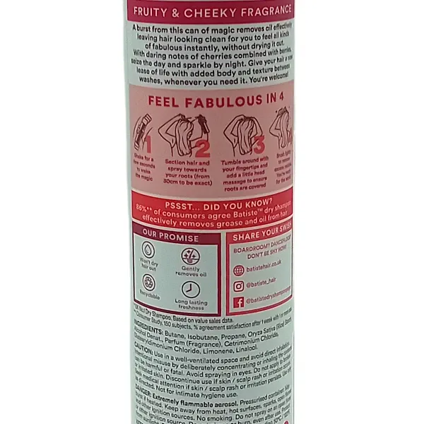 Sa formule enrichie en amidon de riz, vegan et non testée sur les animaux, absorbe le sébum dès la racine pour des cheveux au TOP en un instant. Plus besoin d'eau pour redonner fraicheur et volume à votre chevelure. Avec Batiste CHERRY, offrez à vos cheveux tout le soin qu'ils méritent. CONSEILS D’UTILISATION : 3 étapes ultra simples qui vont vite devenir votre rituel beauté express ! 1- Bien secouer avant chaque utilisation. Vaporiser à 30cm vers les racines 2- Masser du bout des doigts et laisser agir quelques instants 3- Bien brosser et coiffer comme d'habitude *marque présente dans plus de 50 pays à travers le monde