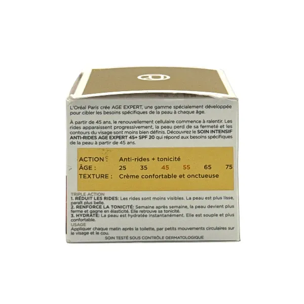Le soin intensif anti-rides âge expert 45+ SPF 20 qui répond aux besoins spécifiques de la peau à partir de 45 ans. réduit les rides sont moins visibles : la peau est plus lisse parait plus belle. Renforce la tonicité semaine : après semaine la peau devient plus ferme et gagne en élasticité, elle retrouve sa tonicité : la peau est hydratée instantanément, elle est souple et plus confortable