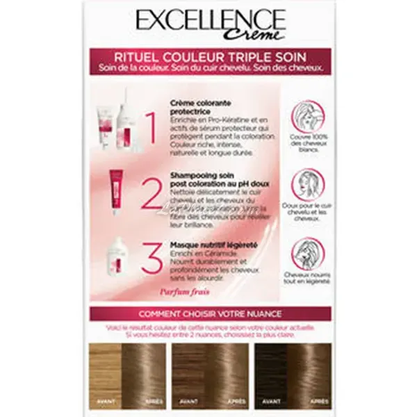 Un blond lumineux aux reflets cendrés qui convient aux cheveux blond très clair à châtain clair. Crème colorante triple soin qui couvre jusqu'à 100% des cheveux blancs. Une routine en 3 étapes qui prend soin de vos cheveux et les respecte. 1) Crème colorante protectrice enrichie en pro-kératine. 2)Nouveau shampooing soin au pH doux qui nettoie délicatement le cuir chevelu 3) Masque nutritif qui rend la chevelure brillante, douce et légère. Couleur riche, lumineuse et soyeuse. Nouveau Excellence Crème, la coloration qui vous respecte* grâce à son nouveau rituel triple soin. Respecte le cheveu grâce à la crème colorante protectrice. Enrichie en Pro-Kératine et actifs de sérum protecteur qui préservent le cheveu pendant la coloration. La couleur est riche, intense, naturelle et de longue durée. Respecte le cuir chevelu grâce au shampooing soin post coloration au Ph doux. Il nettoie délicatement le cuir chevelu et les cheveux du surplus de coloration. La fibre capillaire est lissée pour en révéler toute la brillance. Respecte le cheveu grâce au masque nutritif légèreté. Enrichi en céramides il nourrit durablement et profondément les cheveux sans les alourdir. Nouveau parfum frais floral. Votre couleur est riche et homogène, vos cheveux souples et brillants.