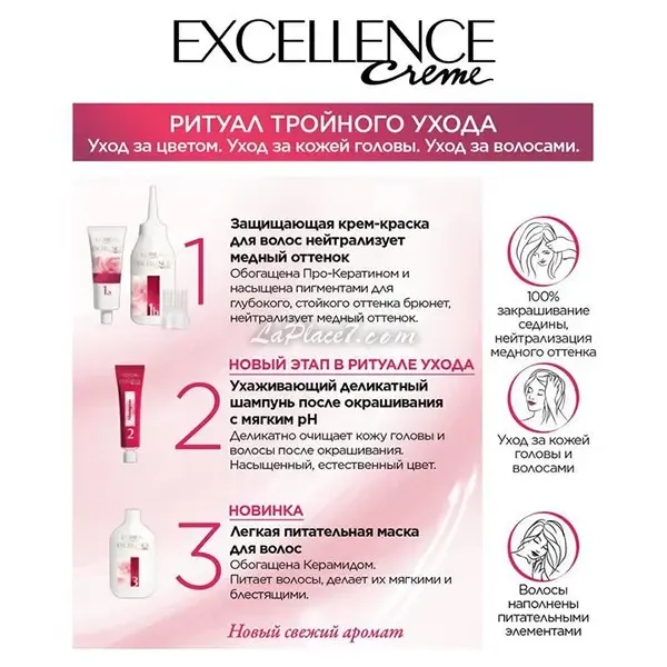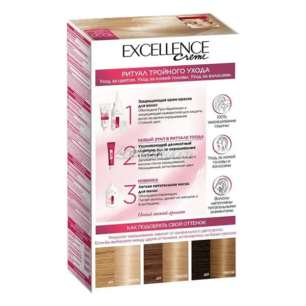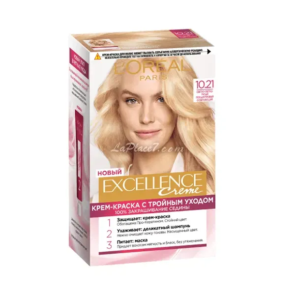 Couleur : blond Nom complet de la teinte : 10.21, blond clair clair nacré éclaircissant Type de cheveux : pour tous les types de cheveux Texture : crémeuse Rituel triple soin : soin couleur, soin cuir chevelu, soin cheveux Excellence de L'Oréal Paris est une crème de coloration triple soin qui protège tout en colorant. Couverture grise à 100 %. N'importe quelle nuance de cheveux, à tout moment, sans l'ombre d'un souci. Avantages : Crème colorante protectrice enrichie en pro-kératine et sérum protecteur pour protéger les cheveux lors de la coloration. Coloration permanente — une nouvelle étape dans le rituel de soin : le shampooing délicat soin après coloration au pH doux nettoie en douceur le cuir chevelu et les cheveux après coloration. Couleur riche et naturelle - masque capillaire nourrissant léger enrichi en céramide, nourrit les cheveux, les rend doux et brillants, sans les alourdir
