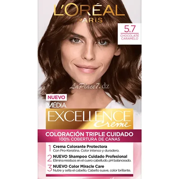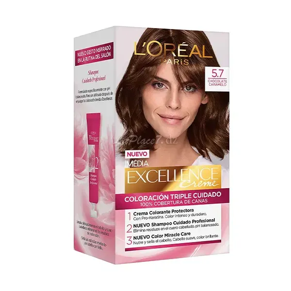 Obtenez une couleur vibrante et une couverture à 100 % des cheveux blancs dès la première application avec la teinture capillaire L'Oréal Excellence Crème 5.7 Chocolat Caramel.