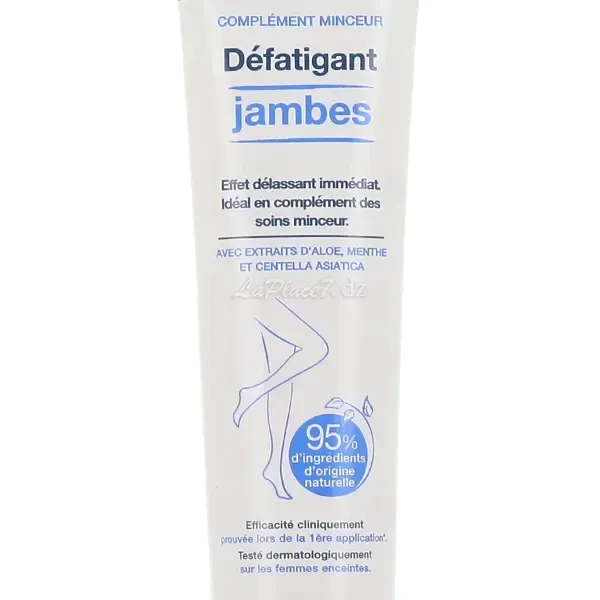 Défatigant Jambes améliore la circulation veineuse des jambes douloureuses avec une sensation de lourdeur, tonifie les parois veineuses, nourrit et hydrate la peau, apaise et procure une sensation de fraîcheur grâce à l’aloe vera, à la centella asiatica, deux extraits naturels de plantes, ainsi qu’à l’huile d’argan. Sa texture gel fraîche et légère pénètre rapidement et laisse sur la peau une sensation de fraîcheur de -1,6 °C. Les jambes sont immédiatement plus légères, fraîches et confortables. 95 % des ingrédients sont d'origine naturelle.