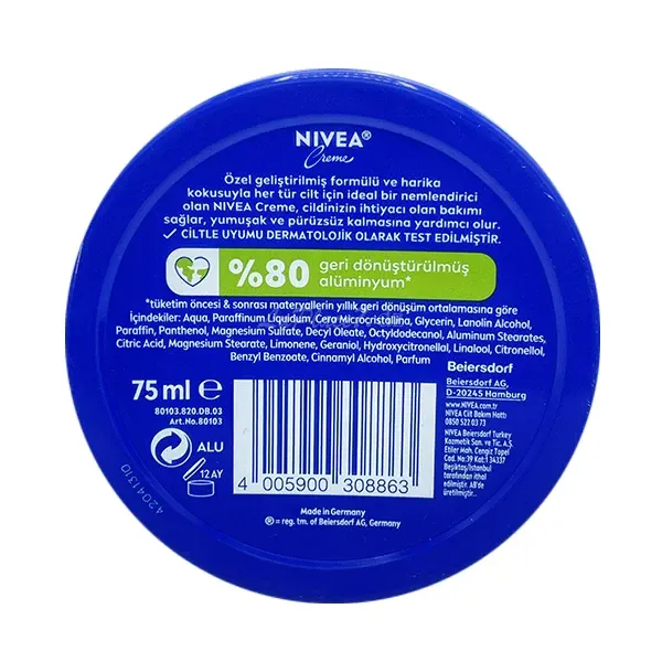 La crème de soin multi-usage visage, corps et mains hydratante NIVEA, enrichie en Eucerit®, hydrate intensément dès la première application et laisse la peau douce et nourrie. Elle convient à toute la famille et a été testée sous contrôle.