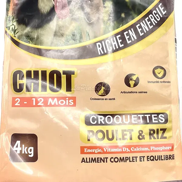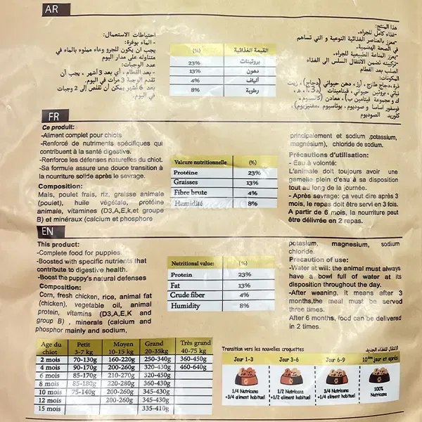 Cet aliment complet pour chiots de 2 à 12 mois, enrichi de nutriments de qualité contribuant à la santé digestive et au renforcement des défenses naturelles, permet une transition en douceur vers l'alimentation solide après le sevrage, avec une valeur nutritionnelle de 23% de protéines, 14% de matières grasses, 4% de fibres.