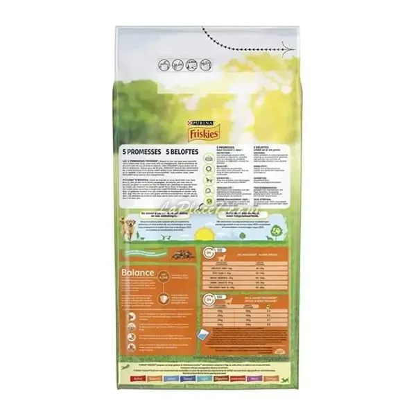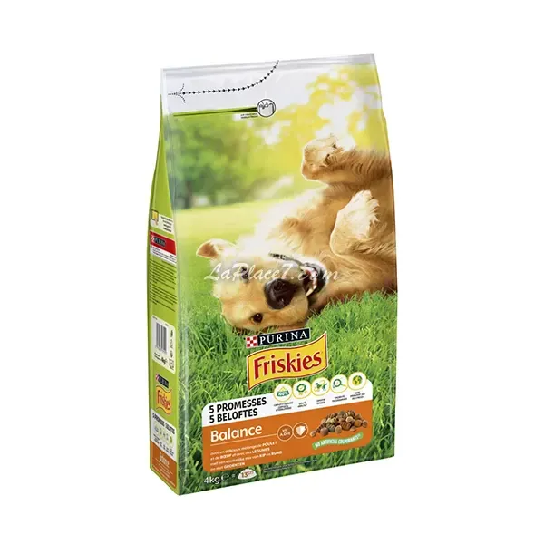 PURINA® FRISKIES® Balance est une savoureuse recette avec un délicieux mélange de Poulet et de Bœuf et avec des légumes, des céréales complètes, des vitamines B et des acides gras Oméga 3 & 6. FRISKIES® Balance est un aliment source de protéines de haute qualité et de tous les nutriments dont votre chien a besoin pour une vie heureuse et en bonne santé. Une savoureuse recette 100 % complète et équilibrée. Sans colorants, arômes et conservateurs artificiels. Aide à soutenir les défenses naturelles. Vitamines A, D & E. Des selles fermes grâce à une digestion saine. Aide à maintenir un poil brillant et une peau saine. Aide à maintenir un regard étincelant, signe d'énergie. Aide à maintenir des dents et des gencives saines. "