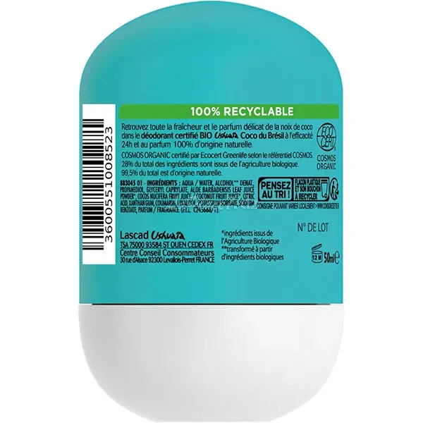 Déodorant à bille pour femme à la noix de coco, Certifié Bio, 24h, Ushuaia, 50 ml