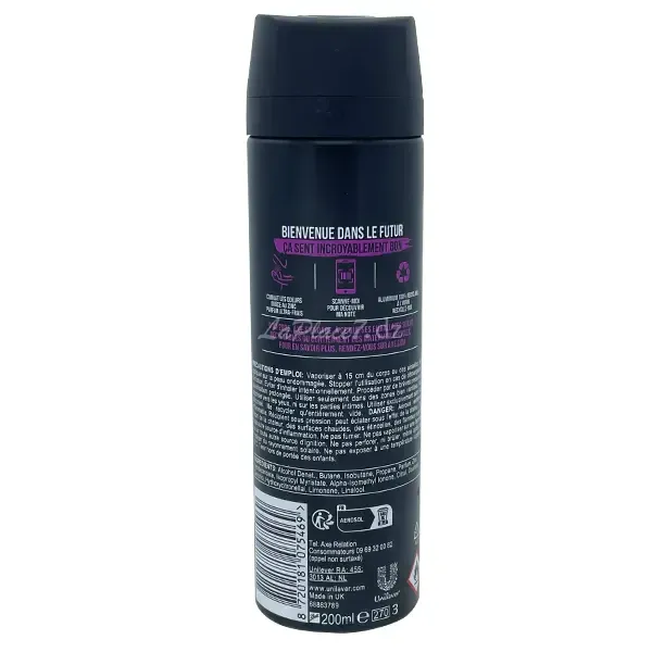 Bienvenue dans le futur, ça sent incroyablement bon ! Reste frais et sens irrésistiblement bon avec le déodorant homme spray AXE Provocation au format 2 x 200 ml. Sa technologie Dual Action™ combat les odeurs de transpiration tout en libérant un parfum ultra-frais de noix de coco et de poivre noir. Efficace pendant 48 h, ce déodorant AXE te permet de rester confiant toute la journée. Secoue, tourne et vaporise le déodorant à 15 cm du corps ou des aisselles. En plus, il est composé d'aluminium 100 % recyclable à l'infini, alors recycle-le