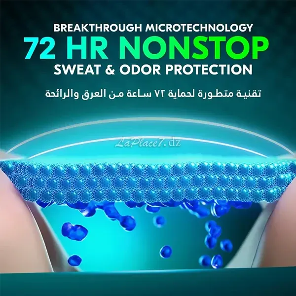 Sans alcool. 72 heures de protection contre la transpiration et les mauvaises odeurs.