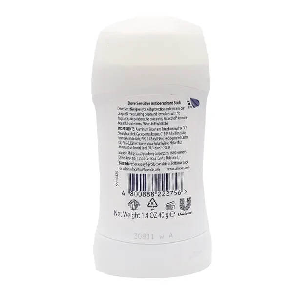 Dove sensible vous offre une protection de 48h et contient notre 1/4 de crème hydratante unique et formulé sans parfum, sans parabènes, sans colorants, sans alcool