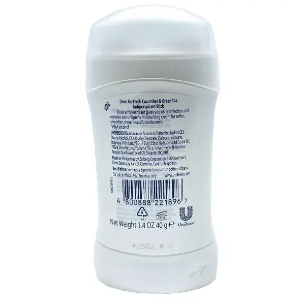 Le déodorant anti-transpirant Dove Go Fresh Cucumber Green Tea combine l'assurance d'une protection jusqu'à 48 heures contre la transpiration avec le parfum rafraîchissant du concombre et du thé vert.