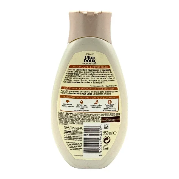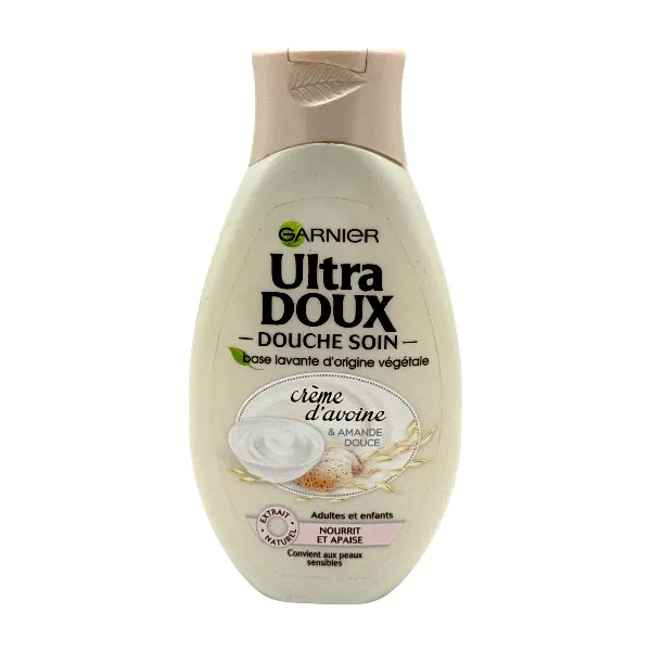 Dans sa douche soin nourrissante et apaisante, Garnier Ultra DOUX a réuni deux ingrédients délicats : la crème d'avoine, céréale prodigieuse reconnue pour ses propriétés nutritives, et l'amande douce, réputée pour ses vertus apaisantes. Cette recette douce et crémeuse lave votre peau en douceur et l'apaise. Elle convient aux peaux sensibles des adultes et des enfants.