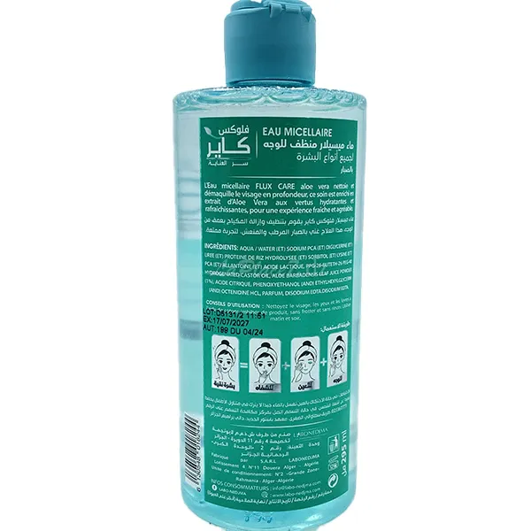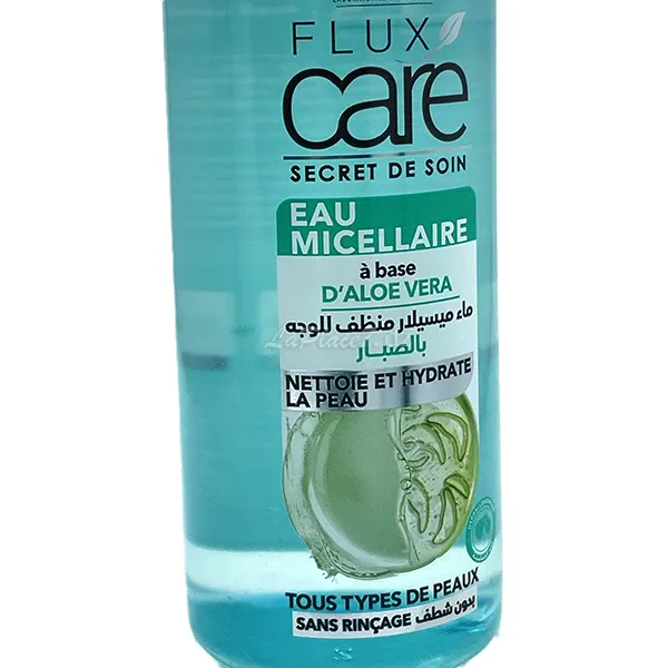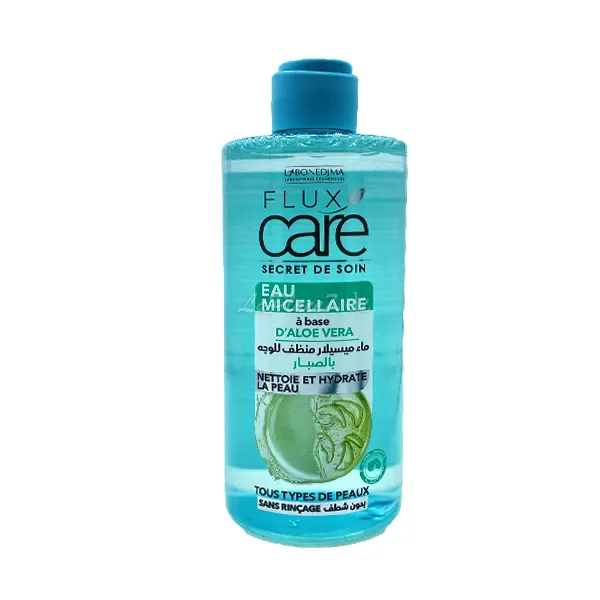 Eau micellaire à l’aloe vera : Offrez à votre peau une expérience de démaquillage douce et rafraîchissante avec l'Eau Micellaire Flux Care.