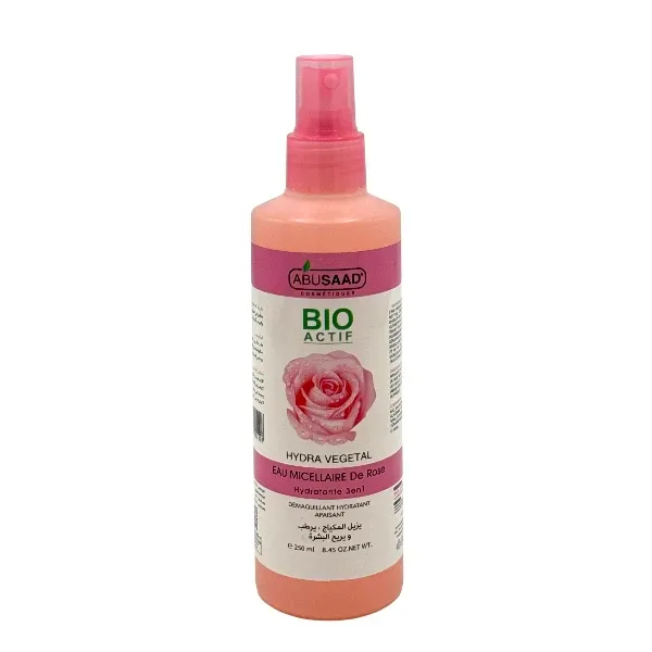Eau micellaire de rose, Hydratante, démaquillante et apaisante 3 en 1, Hydra végétal, Bio actif, Abusaad, 250 ml