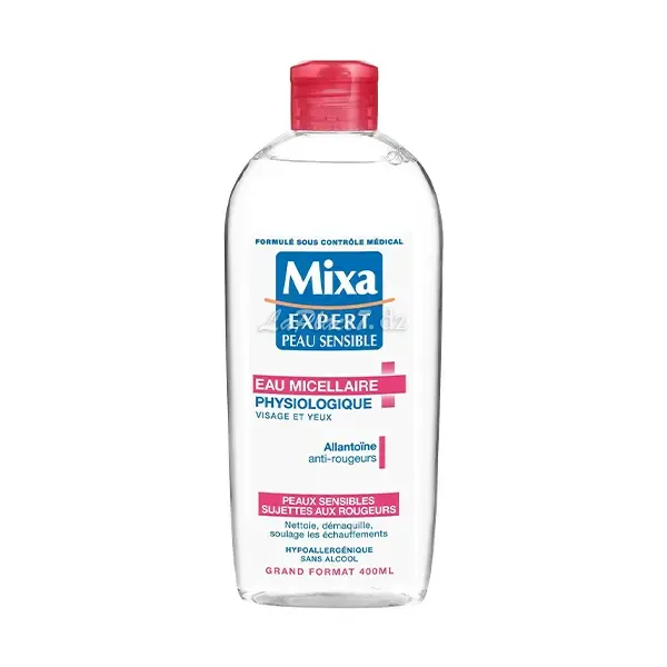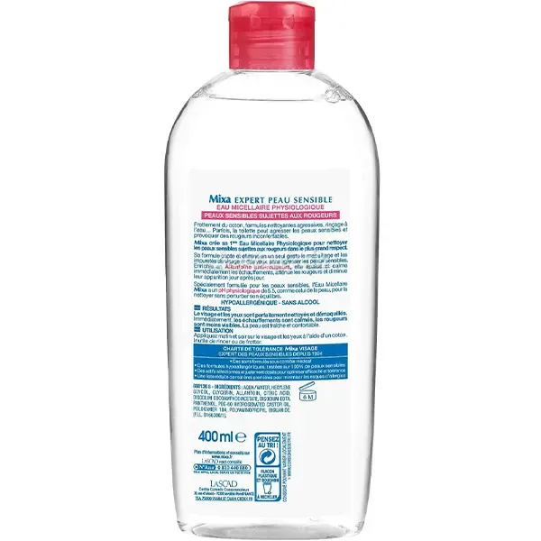 Eau micellaire physiologique pour un visage et des yeux démaquillés et nettoyés, La peau sensible sujette aux rougeurs est apaisée et retrouve tout son confort.