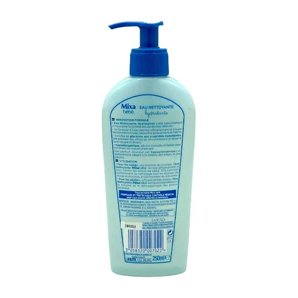 L'Eau nettoyante hydratante de Mixa Bébé a été spécialement conçue pour la toilette des peaux délicates. Sa formule à l'eau nettoie efficacement et ne nécessite pas de rinçage, laissant la peau propre et fraîche. Enrichie en glycérine aux propriétés hydratantes, elle prévient le dessèchement cutané et laisse la peau souple et douce.
