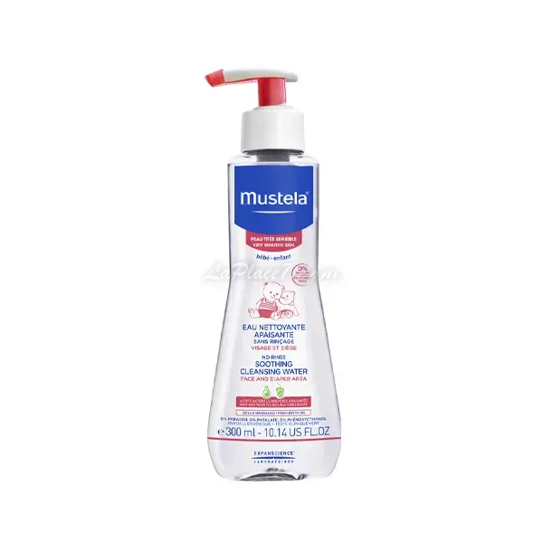 Eau nettoyante apaisante sans rinçage, formulée sans parfum, est destinée aux peaux sensibles des bébés