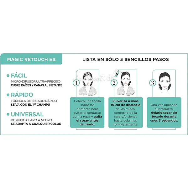 Spray instantané effaceur de racines, qui camoufle vos cheveux blancs temporairement jusqu'au prochain shampooing, en seulement 3 secondes, Il s'accorde à votre couleur, pour un résultat naturel sans démarcation.