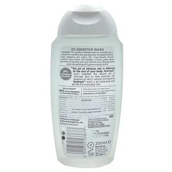 Le Gel lavant intime Peaux Sensibles 0% nettoie en douceur votre zone intime pour un usage quotidien,