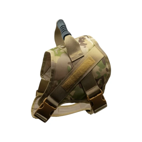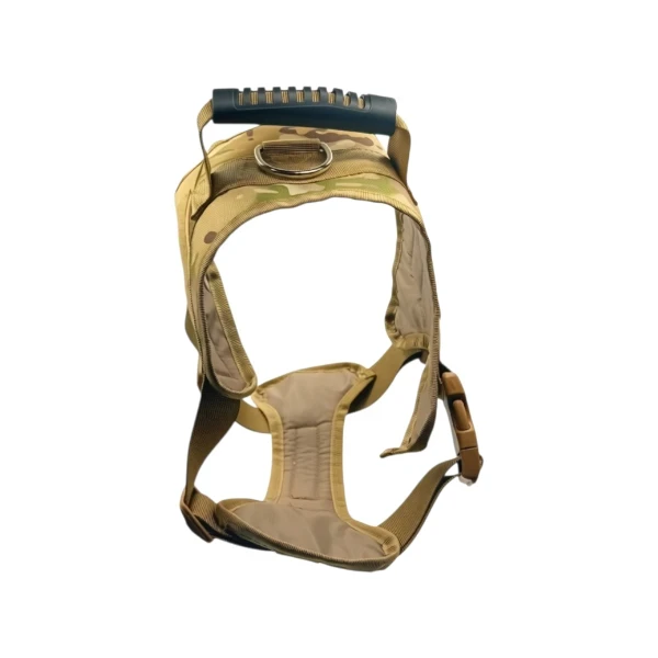 Harnais pour chien en tissu résistant avec motif militaire, conçu pour offrir confort et sécurité lors des promenades.