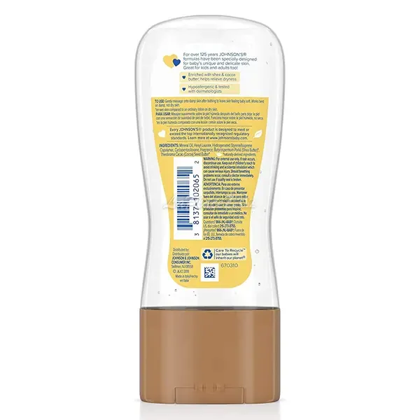 L’huile en gel pour bébés JOHNSON’S Beurre de karité et cacao offre les mêmes bienfaits absorption rapide et complète.