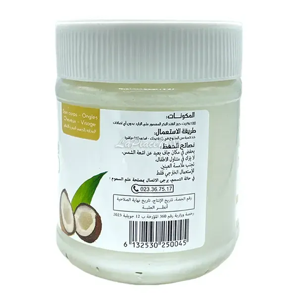 Huile de noix de coco vierge pressée à froid, sans aucun additif.