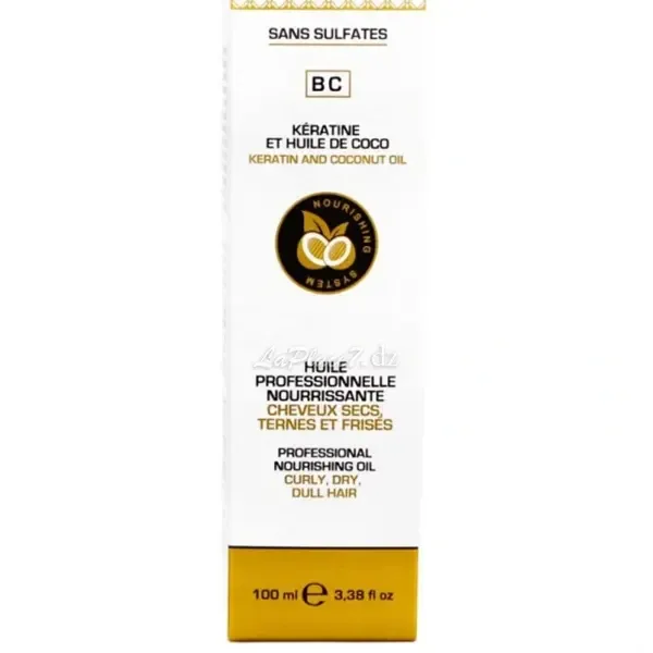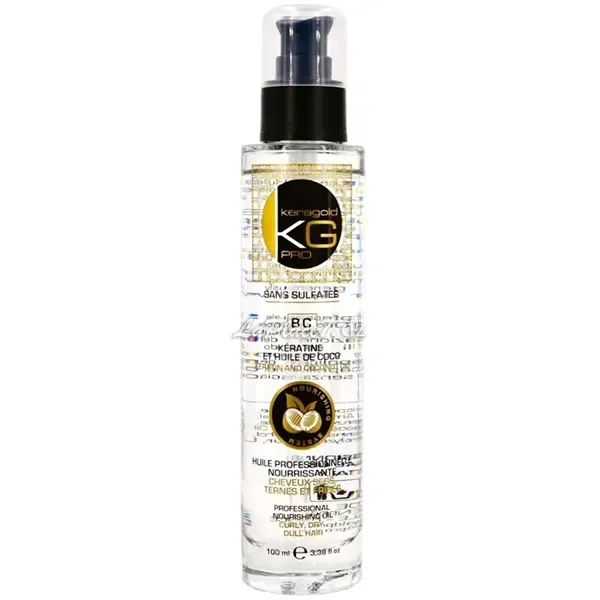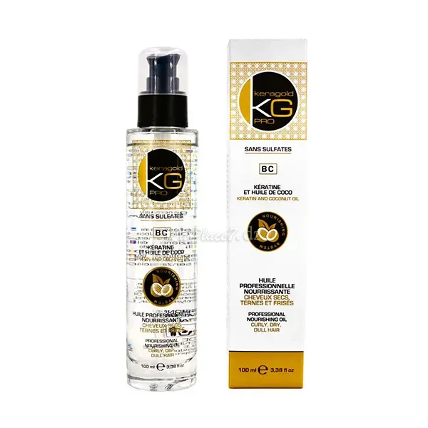 L'huile professionnelle nourrissante BC de Keragold Pro enrichie en huile de noix de coco et en kératine possède une formule hautement nutritive qui maintien l'hydratation des cuticules tout en disciplinant les cheveux.