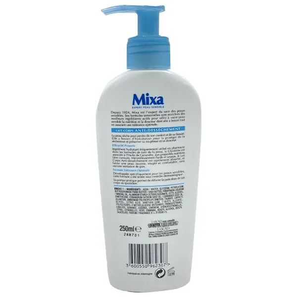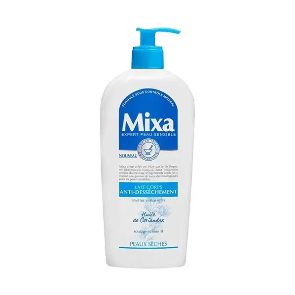 Le Lait corps anti-dessèchement pour peaux sèches à l'huile de coriandre, Expert peaux sensibles – Mixa, 250ml est un soin hydratant intensif formulé pour apaiser et nourrir les peaux très sèches et sensibles. Enrichi en huile de coriandre qui protège la peau des agressions extérieures et procure une sensation de confort durable, avec une texture légère qui pénètre rapidement sans laisser de film gras.