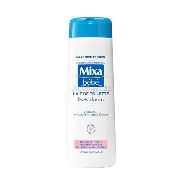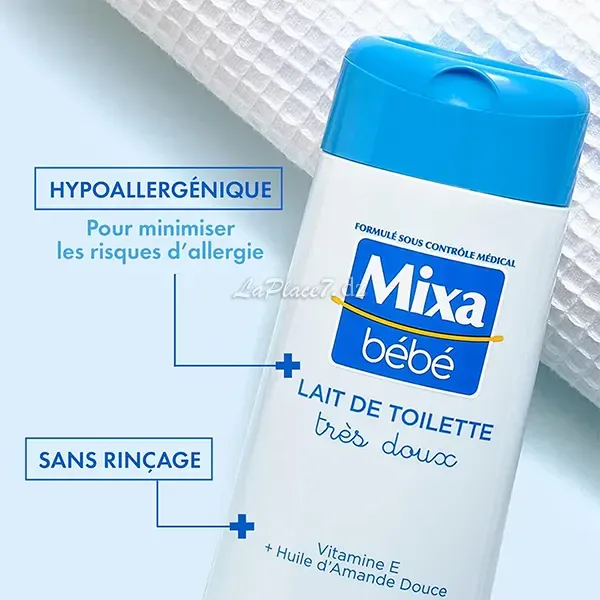 Découvrez le Lait De Toilette Très Doux pour Mixa Bébé FORMULE ENRICHIE La formule du Lait de Toilette Mixa Bébé est très douce : - Enrichie en huile d’amande douce aux propriétés nourrissantes, elle nettoie efficacement et en douceur et favorise le bon équilibre en eau de la peau. - Elle contient de la vitamine E pour protéger efficacement la peau contre les agressions extérieures. - Hypoallergénique, ce lait est formulé pour minimiser les risques d’allergie.