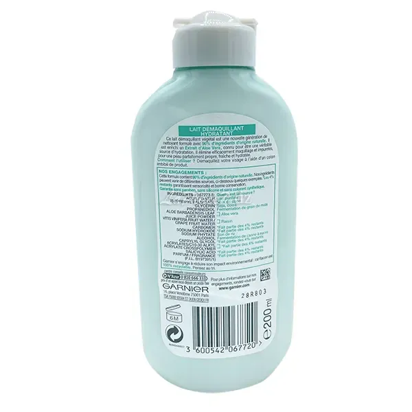 Lait démaquillant hydratant à l'Extrait d'Aloe Vera pour les peaux normales à mixtes.