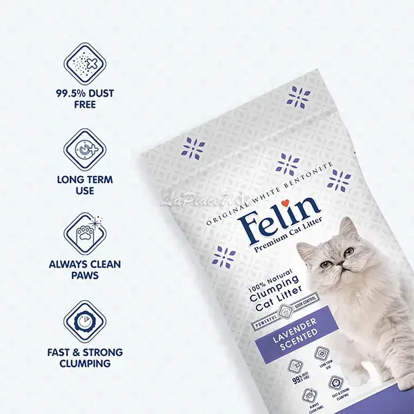Litière pour chat Felin Premium, une litière blanche agglomérante super premium pour chat, 99,5 % sans poussière, 100 % naturelle et respectueuse de l’environnement, super agglomérante, avec contrôle des odeurs, facile à éliminer, à absorption supérieure pour garder le plateau au sec, économique à la consommation, fabriquée à partir de la meilleure bentonite blanche, à utiliser en remplissant le bac à litière avec 7 cm de litière, en retirant quotidiennement les mottes et les déchets solides si nécessaire, et en maintenant toujours le niveau à 7 cm.