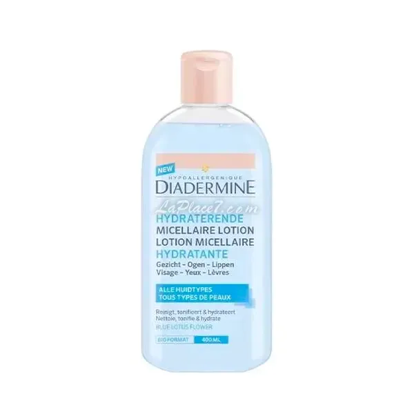 Diadermine Lotion Micellaire Hydratante à l'huile d'argan et à l'extrait de lotus bleu. Est une lotion nourrissante pour le visage qui convient à tous les types de peau. Nettoie en profondeur le visage, les yeux et les lèvres. De plus, il hydrate, rafraîchit et renouvelle la peau.