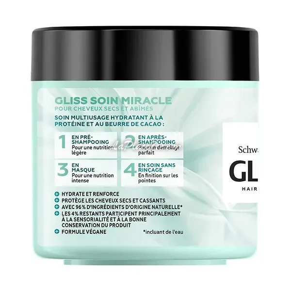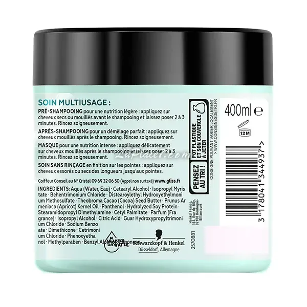 MASQUE pour une nutrition intense : appliquez délicatement sur cheveux mouillés après le shampooing et laissez poser 2 à 3 minutes. Rincez soigneusement.