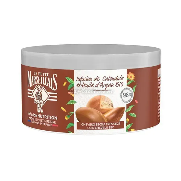 LE PETIT MARSEILLAIS : Masque Infusion Nutrition Multi-Usage, Cheveux secs à très secs, Cuir chevelu sec Vos cheveux sont très secs ou frisés et manquent de douceur et de souplesse ? Ils ont besoin d’être intensément nourris ! Découvrez notre MASQUE INFUSION NUTRITION MULTI-USAGE à l’infusion de Calendula Bio & à l’Huile d’Argan Bio. NOTRE RECETTE DE SOIN Notre recette authentique Infusion Nutrition prend soin de votre cuir chevelu et de vos cheveux. Sa formule est composée : D’Infusion de Calendula Bio, fleur mythique reconnue pour ses propriétés protectrices et nourrissantes. D’Huile d’Argan Bio, réputée pour son pouvoir hautement nutritif. 4 FAÇONS de l'utiliser : En masque : Pour nourrir parfaitement. En après-shampoing : Pour démêler tout en nourrissant sans alourdir. En soin sans rinçage : Pour protéger vos pointes. En masque de nuit : Pour réparer toute la nuit. UN GESTE NATURE POUR MES CHEVEUX 96% d'ingrédients d'origine naturelle SANS SILICONE pour un toucher naturel TESTÉ SOUS CONTRÔLE DERMATOLOGIQUE