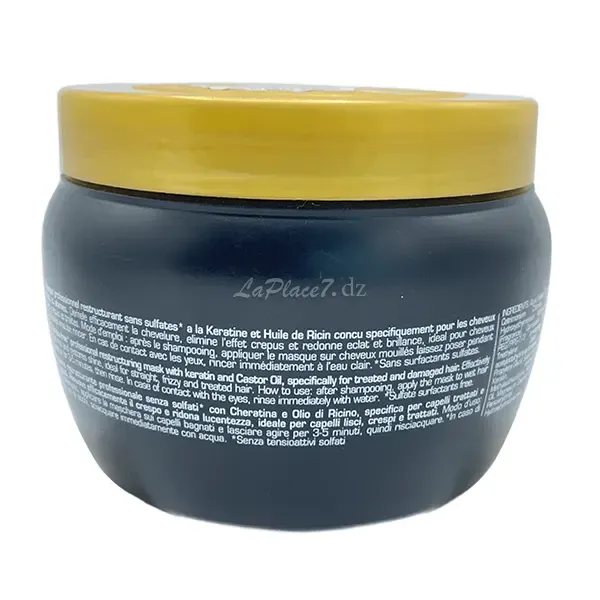 Masque Restructurant à la Kératine et à l’Huile de Ricin pour cheveux traités et abimés. Il démêle efficacement, élimine l’effet crépu, apporte une douceur immédiate, restructure en profondeur, redonne de l’éclat, de la luminosité, de la force et du tonus. Idéal pour les cheveux lissés, crépus et traités.