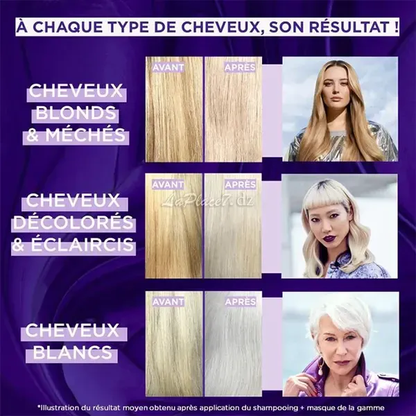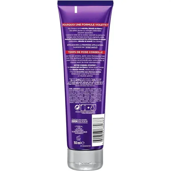 Vos cheveux sont méchés blonds ou blancs? Des reflets jaunes ou orangés indésirables peuvent apparaître Comme le violet est la couleur opposée au jaune et à l'orange notre formule enrichie en pigments violets neutralise instantanément les reflets jaunes et orangés indésirables démêle et nourrit vos cheveux Efficace dès la première application : la preuve sur l'oréal Paris fr Temps de pose conseillé Une fois par semaine après votre Shampooing Violet Déjaunisseur Color-Vive Appliquez sur cheveux humides et laissez poser le temps recommandé selon votre couleur de cheveux puis rincez abondamment.
