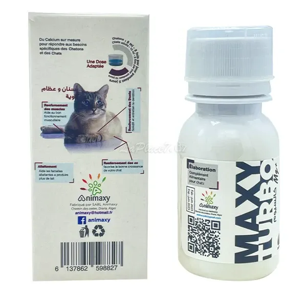 Multi-vitamines à base de calcium, complément alimentaire pour grands et petits chats, Renforce les dents et les os, Maxy Turbo Calcium Mg+, Animaxy, 60ml