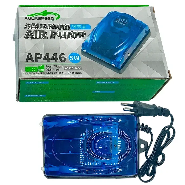 Caractéristiques du produit : Longue durée de vie, conception écoénergétique, faible niveau sonore et débit élevé. Idéal pour alimenter les jouets, les diffuseurs d'air et les pierres à air. Favorise l'oxygénation de l'eau en briseant la surface. Modèle AP-446 : Pompe à air double flux, débit : 2 x 4 L min, puissance : 5 W.