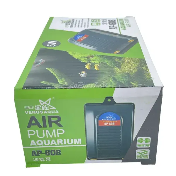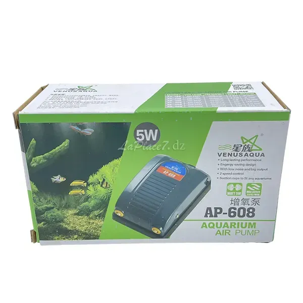 Cette pompe à air double est équipée de deux ports pour une efficacité maximale. Alimentée en 220-240 V à une fréquence de 50/60 Hz, elle offre une puissance de 5 W et un débit maximal de 2 x 4 l/min.