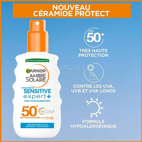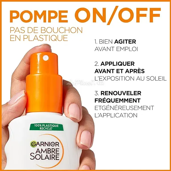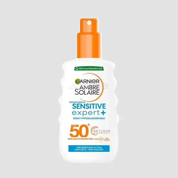 Garnier Ambre Solaire Sensitive Expert+ Enfant Spray protecteur pour les peaux claires, sensibles et intolérantes au soleil. Très haute protection FPS50+ contre les UVB, UVA et UVA Longs. Hypoallergénique. Sans parfum. Texture légère. Résiste à l'eau, au sable et à la transpiration. 200ml. Durée d'utilisation après ouverture : 12 mois.