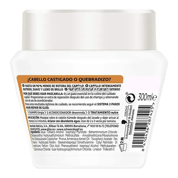 Le masque nutritif gliss réparation totale est spécialement élaboré avec une formule contenant un complexe de 19 ingrédients actifs. Pénètre en profondeur dans les cheveux, réduisant leur casse jusqu'à 95 % et apportant douceur et brillance. Conseil d'application : masser sur cheveux humides après le lavage et laisser agir au moins 1 minute. Rincer abondamment à l'eau. Utiliser 2 à 3 fois par semaine.