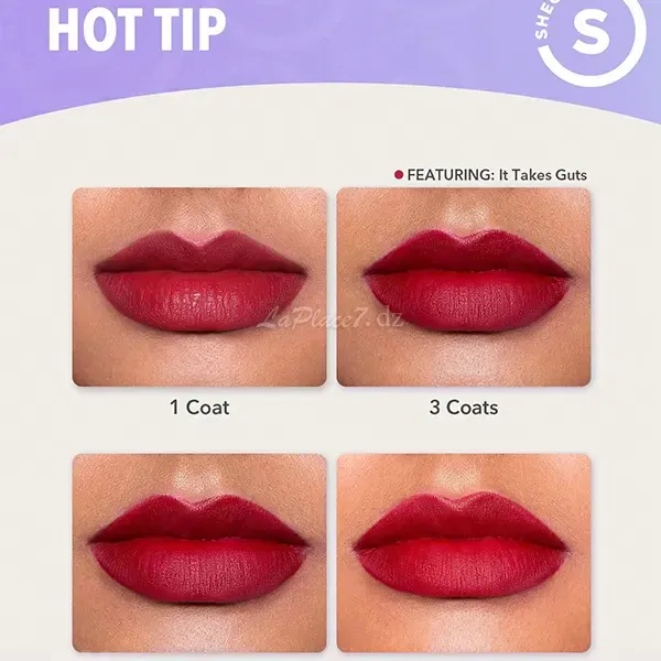 Avantages : sans alcool, végétalien, sans minéraux ajoutés, sans gluten, sans parabènes, longue tenue, sans cruauté, sans transfert, hautement pigmenté, recyclable.