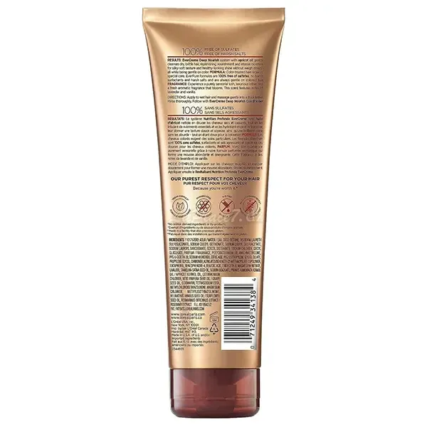 Shampooing nutrition profonde sans sulfates : Nourrissez vos cheveux à la perfection. Le shampooing EverPure nutrition profonde sans sulfates est spécialement conçu pour nourrir en profondeur les cheveux secs et cassants, tout en protégeant votre couleur.