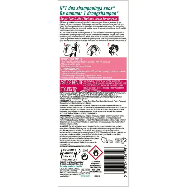 Sa formule enrichie en amidon de riz, vegan et non testée sur les animaux, absorbe le sébum dès la racine pour des cheveux au TOP en un instant. Plus besoin d'eau pour redonner fraicheur et volume à votre chevelure. Avec Batiste CHERRY, offrez à vos cheveux tout le soin qu'ils méritent. CONSEILS D’UTILISATION : 3 étapes ultra simples qui vont vite devenir votre rituel beauté express ! 1- Bien secouer avant chaque utilisation. Vaporiser à 30cm vers les racines 2- Masser du bout des doigts et laisser agir quelques instants 3- Bien brosser et coiffer comme d'habitude *marque présente dans plus de 50 pays à travers le monde