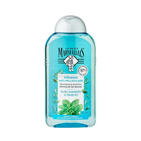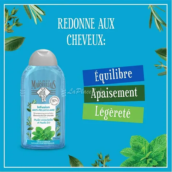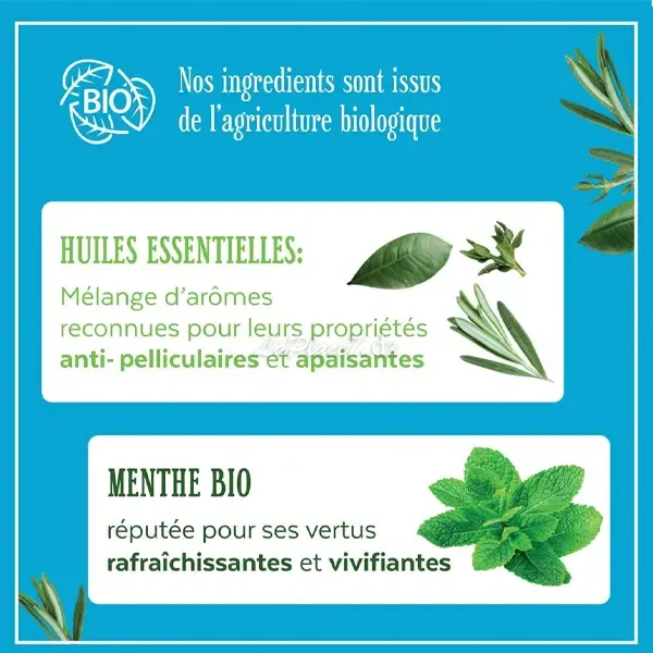 Ce mélange contient des Huiles Essentielles de thym et de romarin, reconnues pour leurs propriétés antipelliculaires ,et de camomille, pour ses propriétés apaisantes,
