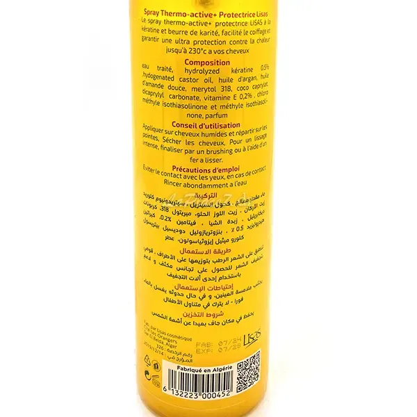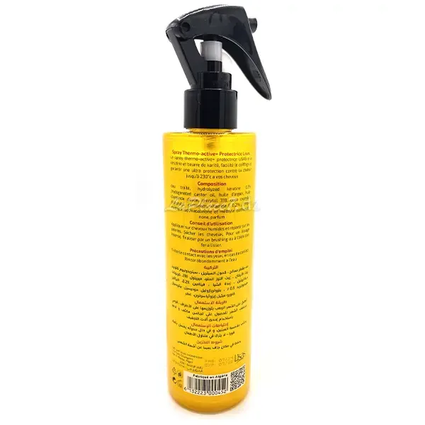 Spray Lisas Thermo-actif 200ml Lissage facile, anti-frizz & protection thermique jusqu’à 230°C. Sans rinçage, enrichi en kératine & huile d’argan pour des cheveux doux, brillants et parfaitement protégés.